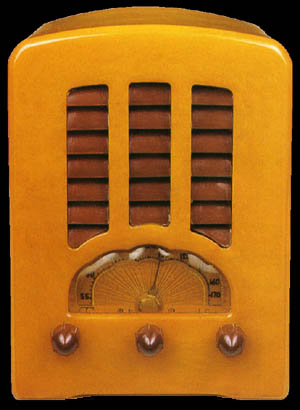Emerson BT245 Yellow with burgundy grill 1938. This modell was also made in beautiful colors that were accented by the contrasting louvered grilles and knobs. The unit in the picture is mint. AC price from 3,500+